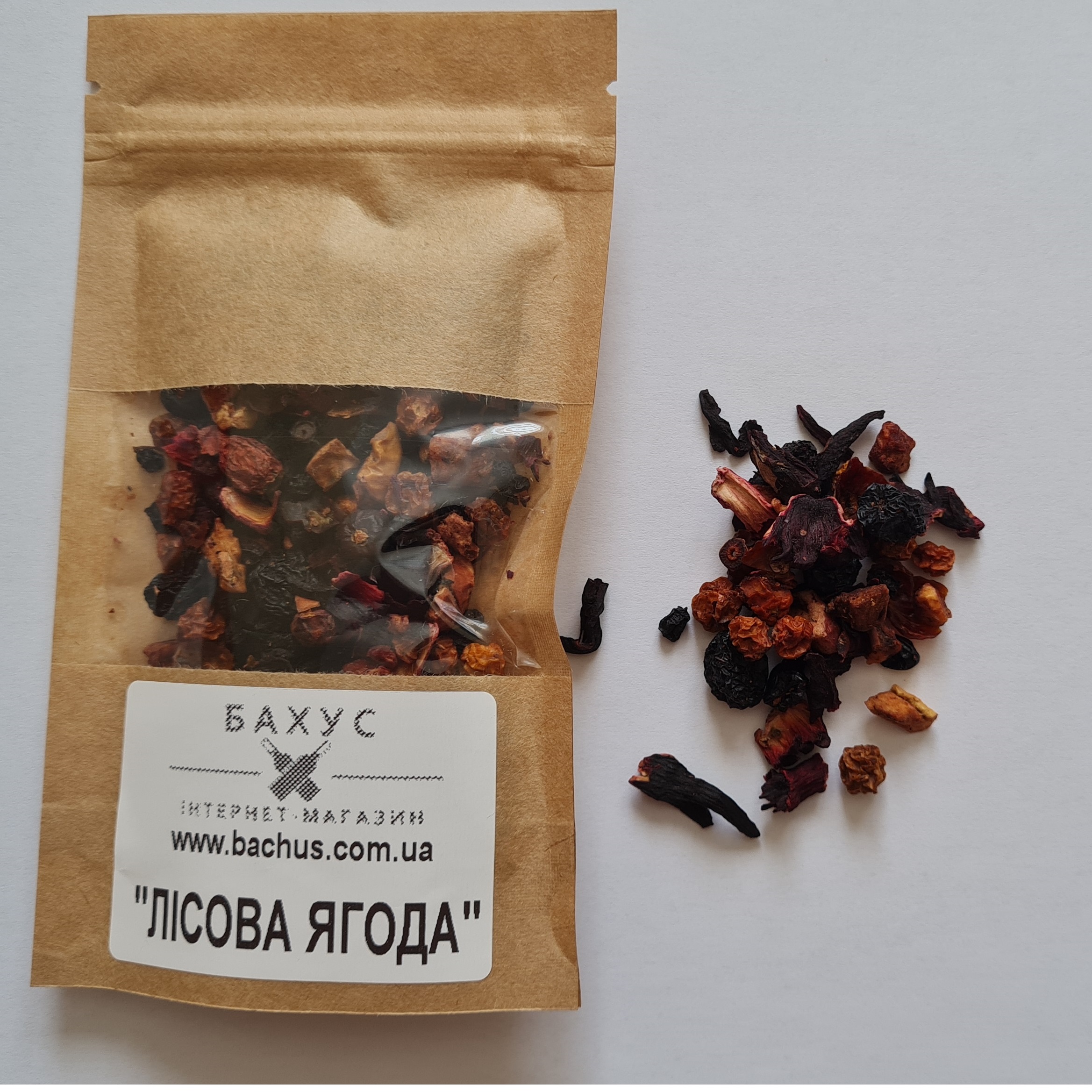 Склад:Пелюстки каркаде з ягодами чорниці, червоної горобини, чорної бузини, чорної смородини, ялівцю, плодами аронії, глоду, шматочками яблук і шипшини.